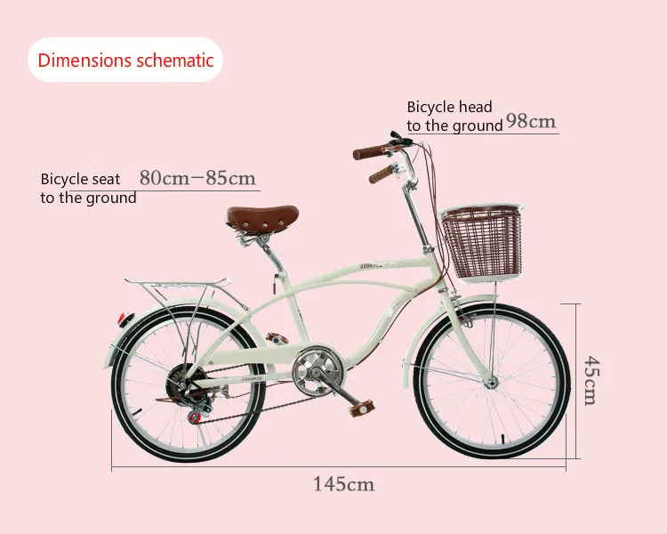 Material: carbon steel carFrame structure: overall carLoad capacity: 90kgFrame type: hard frameFoot type: ordinary pedalBrake type: rear brakeColor: white, brown, yellow brown, pink,Style: single speed, variable speedSize: 20ServicesDedicatedcustomerservice.WearetheAliexpresscertifiedseller,weobeytheReturnPolicyofAliexpress.EnjoyshoppingbyAliexpressBuyerProtection.