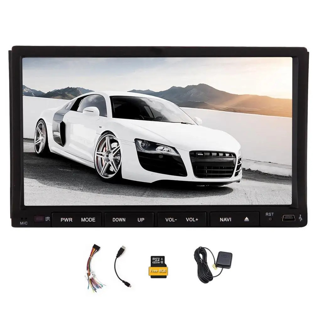 Double 2DIN In Dash 7" Car Stereo CD DVD Player GPS USB SD Bluetooth IPOD FM Radio multimedia playback General Features: 2din car gps universal 7 inch digital TFT Touch Screen With TF Card Slot,With USB port Newest Win8 UI, it is more intelligent, more to meet your diverse needs . Item Description: - OSD Language: English,Russian,German,Spanish,French,Italian,Portuguese etc. - Media Type CD,HDCD,MP3,WMA,VCD,DVD,DVD-R/RW,DVD+R/RW,CD-R/R W, JPEG, AVI, DIVX, etc. - Built-in GPS receiver, come with FREE 8GB MAP Card - AM FM Range Worldwide - With Remote Control - Power-off with auto-memory store function under radio - Clock Function - Mute Function - Wireless Bluetooth Function - Bass & Treble,L & R channel stabilizer - RCA AUX IN Function - Rear Camera Input - Steering Wheel Control - Video warning function - blue background LED light - Video Input: 2 Channels, One for camera, one for aux in - Video Output: 2 Channels - Audio Input: 1 Channel for aux in - Audio Outpu: 4.1 Channels Accessories: 1 x Car DVD Player 1 x GPS Antenna 1 x 8GB MAP Card(in the gps port) 1 x Power Harness 1 x User Manual 1 x Mounting brackets